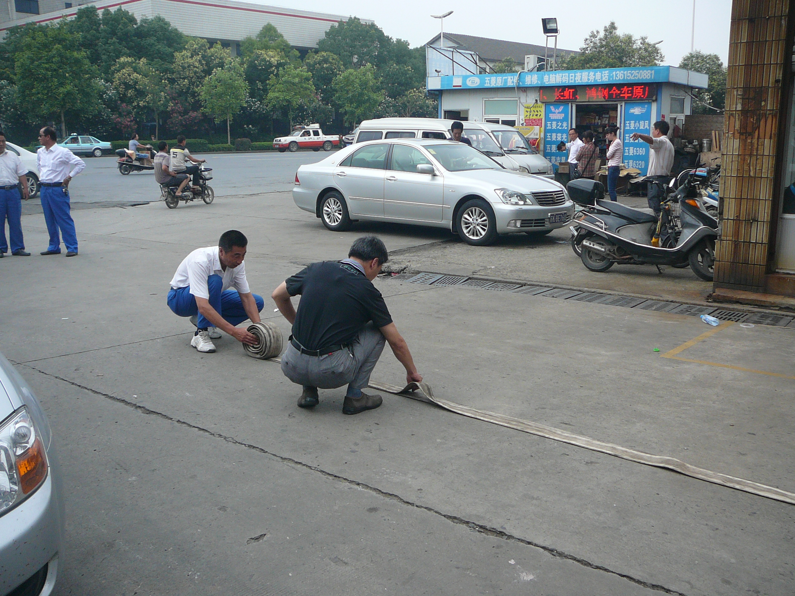 在活動現場,消防隊員每兩人一組,進行撒水帶、連接消防接口等方法的演練。隊員們一絲不茍地按照工作流程進行著操作,并熟練地掌握了消防栓連接操作要領,即用手卡住水帶,小手臂用力,向前方拋出四十五度左右時,除拇指和食指外,其余手指自然松開,水帶主體拋出,手中只留兩個接口;將其中一個接口放在地上或就地在消防栓栓口,消防栓出水,分水器口;拿起另一個接口迅速向前方跑去,邊跑邊拿出水槍進行連接。