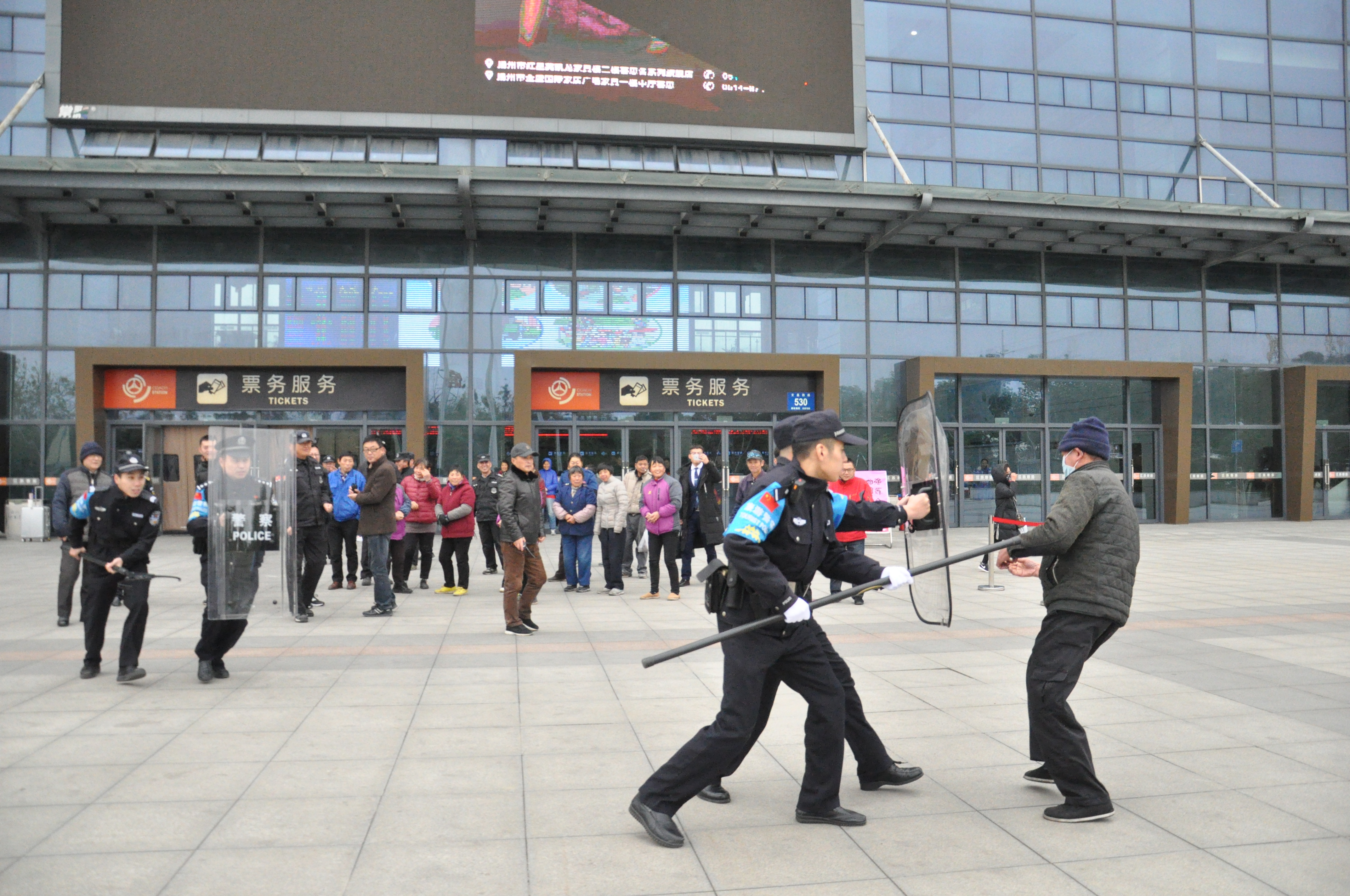 為有效防范公共場(chǎng)所可能發(fā)生的暴力恐怖事件,加強(qiáng)車(chē)站工作人員安全防范意識(shí),提高對(duì)突發(fā)事件的應(yīng)急處置能力,12月7日下午,揚(yáng)州站聯(lián)合揚(yáng)州市公安局公交治安分局汽車(chē)總站派出所,在站前廣場(chǎng)開(kāi)展年度反恐防暴演練。