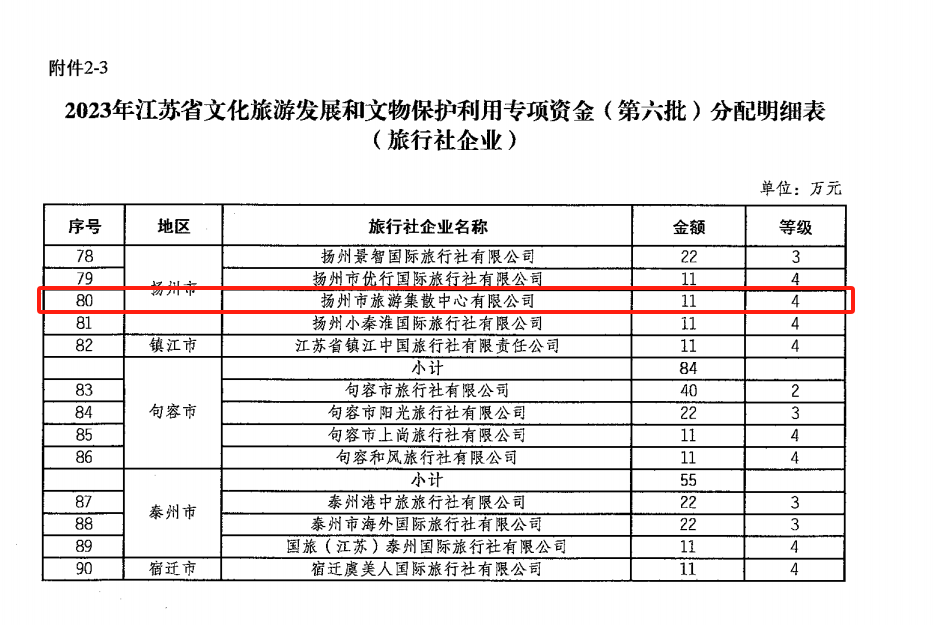 近日,江蘇省財政廳、江蘇省文化和旅游廳公示了2023年江蘇省文化旅游發(fā)展和文物保護利用專項資金旅行社企業(yè)名單,揚州旅游集散中心成功入選。