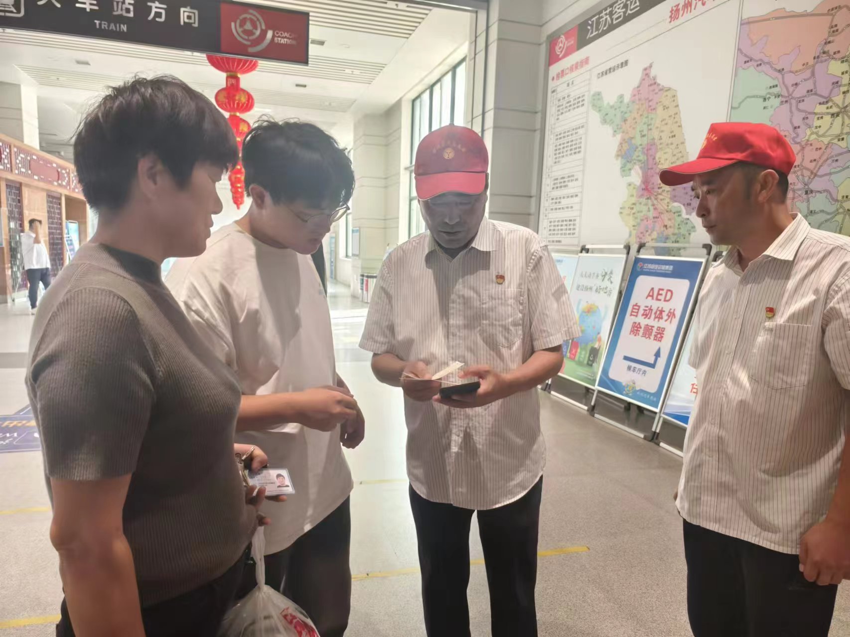 志愿者們有序在車站的售票廳、候車廳、安檢處、發(fā)車平臺(tái)等崗位為旅客提供文明勸導(dǎo)、秩序維護(hù)、行李搬運(yùn)、茶水服務(wù)等志愿服務(wù),并耐心解答旅客的每一個(gè)問題,細(xì)心指引旅客前往購(gòu)票窗口、候車區(qū)、檢票口等關(guān)鍵位置,確保每一位旅客都能順利、愉快地踏上旅程。針對(duì)老弱病殘?jiān)械戎攸c(diǎn)旅游群體,志愿者們熱情為其提供“一對(duì)一”重點(diǎn)幫扶,全力保障旅客群體安全便捷出行。在揚(yáng)州汽車站候車大廳、汽車東站服務(wù)臺(tái)均設(shè)立了黨員示范崗,黨員志愿者們亮明身份,主動(dòng)接受旅客監(jiān)督。